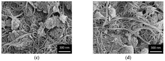 Figure 2 shows the morphology of neat SWCNT BP and GO-SWCNT BPs with different GO content (25, 50, and 75 wt.%). SWCNT BP morphology was characterized by the presence of the typical SWCNT bundles and clusters arising from π–π and van der Waals interactions. The found porous structure is expected to give BPs a high permeability and a large contact surface area for heavy metal adsorption. The addition of an increasing amount of GO in SWCNT BPs resulted in increased GO sheets number homogenously hosted inside the membranes.