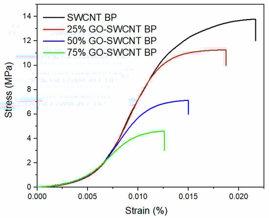 Stress-strain curves of SWCNT BP with different weight percentage of GO.