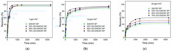Pb2+ recovery by neat SWCNT BP and GO-SWCNT BPs during soaking in 800 mL of aqueous solutions with [Pb2+] of: (a) 1 ppm, (b) 10 ppm, and (c) 50 ppm.