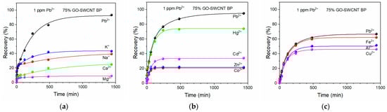 Pb2+ recovery by 75% GO-SWCNT BPs during the soaking in 800 mL of: (a) a mineral water solution with [Pb2+] of 1 ppm, (b) a multielement heavy metal solution with Pb2+, Co2+, Zn2+, Cd2+, and Hg2+, (c) a multielement heavy metal solution with Pb2+, Fe3+, Al3+, and Cu2+. The concentration of each heavy metal in the multielement solutions was 1 ppm.