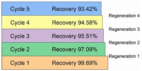 Stability in the adsorption performance after regeneration is an important item for every adsorbent in view of its potential industrial applications. The adsorption performance of 75% GO-SWCNT BP was measured in 1 ppm lead solution after four regeneration processes, performed by soaking the membranes in a 10% (v/v%) aqueous solution of 2-mercaptoethanol for 24 h in order to favor the release of the adsorbed lead. As shown in Figure 6, the initial recovery found after the first immersion in the lead solution was 99.69% and decreased to 93.42% during the fifth adsorption cycle performed after the fourth regeneration process, confirming the reusability, efficiency, and stability of membranes.