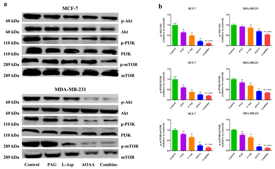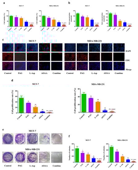 Followed by the 24 h treatment, it was observed that the migration and invasion of MCF-7 and MDA-MB-231 cells were reduced in each of the PAG-, L-Asp-, and AOAA-treated groups when compared to the control group. Furthermore, when we used the drugs in combination, a greater inhibitory effect on MCF-7 and MDA-MB-231 cell migration and invasion was recorded compared to the separately treated groups (Figure 2a,b). These results demonstrate that pharmacological treatment with these drugs could significantly inhibit the migration and invasion of human BC cells.
