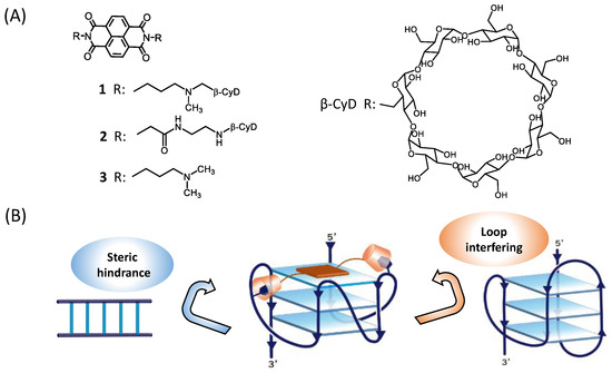 (A) Chemical structure of NDI-β-CyD conjugators, 1, 2 with simple NDI, 3; (B) Supposed mechanism of NDI-β-CyD preferring binding to parallel G-quadruplex.