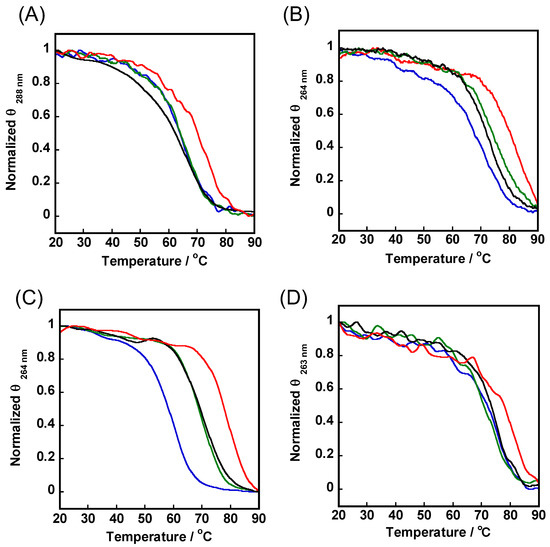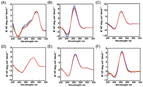 CD spectra of the annealed 1.5 μM DNA or RNA were measured in 50 mM Tris-HCl buffer (pH 7.4) with 100 mM KCl at 25 °C, with a JASCO J-820 spectrophotometer equipped with a temperature controller, in the presence of 0 μM to 4.5 μM of 1–3. The measurement was performed at a scan rate of 50 nm/min, using a Jasco J-820 spectropolarimeter (Tokyo, Japan) with the following conditions: response, 4 s; data interval, 0.2 nm; sensitivity, 100 mdeg; bandwidth, 2 nm; and scan number, 4 times.