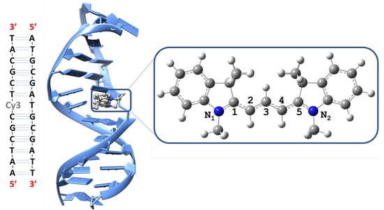 Classical Ensemble: The Cy3-DNA system shown in Figure 1 was built using Chimera [44] version 1.14. The system is adapted from the experimental work of Heussman et al. [5], but a shorter sequence was used to reduce the computational cost. The MD setup and simulation was handled by Gromacs/2018.8. [45]. The force field parameters of Cy3 were derived from Amber99SB-dyes force field [46]. The missing linker parameters were obtained from the general Amber force field [47] (GAFF). The electronic density matrix of Cy3 optimized with B3LYP/6-31G(d) and the Gaussian16 package [48] was used to obtain the restrained electrostatic potential [49] (RESP) charges. The RESP charges fitting was undertaken using the Antechamber [50] package. The DNA part of the system was treated by Amber99SB-ILDN force field [51,52]. The system was solvated with TIP3P water [53], 100 mM NaCl, 6 mM MgCl, and neutralized by Na in a cubic box of length 84.90 Å, resulting in a total number of 60,432 atoms. The energy of the system was minimized in vacuo using a steepest descent algorithm for 1000 steps. For initial equilibration, the temperature was gradually increased to 298 K in an NVT ensemble for 1 ns using a velocity-rescaling thermostat [54,55]. Further equilibration to reach a constant pressure of 1 bar was run for 1 ns in an NPT ensemble using a Parrinello–Rahman barostat [56,57]. For the MD production, the system was propagated using the leapfrog integration scheme [58] for 200 ns in an NPT ensemble. The equilibrations and the MD-production with periodic boundary conditions were propagated using a step size of 2 fs. The cutoff distance for the non-bonded interactions was set to 15 Å, and the long-range electrostatic interactions were accounted for by the particle mesh Ewald summation method [59].