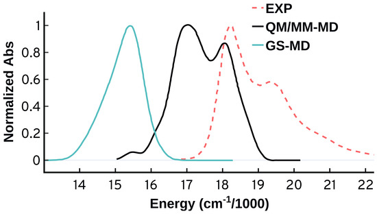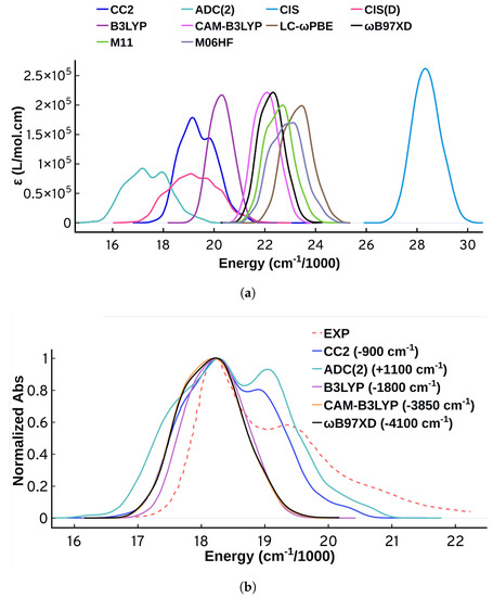 There are several methods that can be used to model the spectra of chromophores in solution [15,16,17,18]. Calculating vertical excitations at equilibrium (VEE) is the simplest approach to simulate the spectra and is usually used for the initial benchmarking of the ability of quantum mechanical methods to capture the energetics of the excited states. In this approach, VEEs are calculated, and the spectra can be plotted by means of Gaussian or Lorentzian functions [18,19]. This approach is mainly limited to comparisons with the maximum of experimental spectra, it does not account for the zero-point energy (ZPE), and it cannot give information about the vibronic effects or any broadening, especially when the thermal contributions are prominent [18,19].