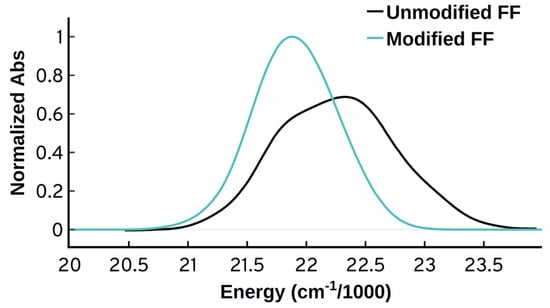 Figure 5 shows the non-shifted spectra obtained from the unmodified [46] and modified force field using B97XD/Def2SVP-QM/MM. Adjusting the polymethine chain C-C bonds and the neighboring N-C bonds clearly has an effect on the spectrum resulting in a narrower and more symmetric spectrum. However, the attempted reparameterization did not reproduce the distinctive spectral features of the experimental spectrum. Nevertheless, it shows that it is very important when obtaining force field parameters to check whether they are appropriate for the system under investigation, since these parameters can have a significant effect on the spectra and other properties.