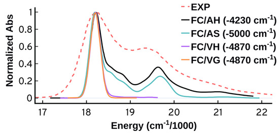 Spectra at 0 K obtained using the Franck–Condon adiabatic (AH and AS) and vertical (VH and VG) approaches. The time-independent (TI) approach at 0 K was used. The spectra are normalized and shifted to match the maximum of the experimental peak.