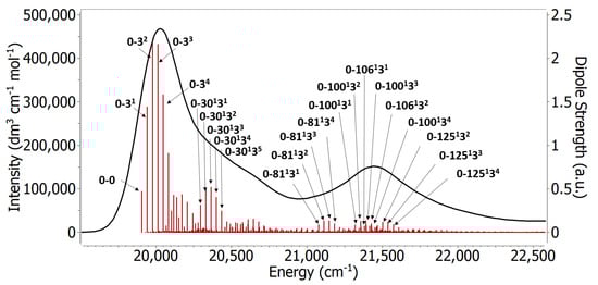 The vibronic spectrum obtained from structures optimized with B97XD/Def2SVP in gas phase at 0 K using the AH approach. The red sticks correspond to the vibrational excitations. The labels on the sticks are selected transitions.