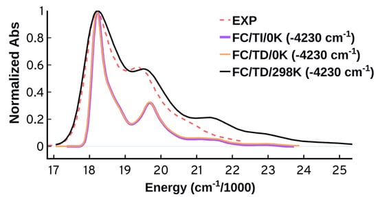 In order to reproduce the experimental spectrum we need to consider the temperature effects as well. Here we test the temperature dependence with the time-independent and time-dependent schemes. The adiabatic Hessian approach is used with structures and frequencies obtained from B97XD/Def2SVP in the gas-phase. As shown in Figure 9, the performance of the TD approach is identical to the TI approach at 0 K, and that should be the same case when we use higher temperatures. The TI approach requires a very large number of summations of Franck–Condon integrals which is computationally expensive, especially at higher temperatures, and prescreening schemes have been developed to choose the most relevant transitions [39,94]. Using the prescreening scheme, we were able to get information about the most relevant vibrational transitions at room temperature but not much of an improvement to the spectral shape (see Section SM-3.3). Relaxing the default prescreening criteria implemented in Gaussian16 [73], however, is computationally too expensive and cannot converge. On the other hand, the TD approach includes all the initial and final vibrational states at any temperatures at no extra computational cost which results in the calculation of more accurate spectral shapes [94,95].