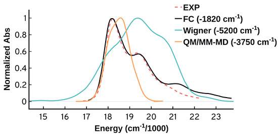 The Franck–Condon approach not only outperforms the ensemble approaches in predicting the spectral bands and shapes in good accuracy, it also displays a significant improvement in predicting the energetics, see Figure 11. The predicted by the FC calculation overestimates the experimental maximum by 1820 cm (0.23 eV) compared to 5200 cm (0.64 eV) for the quantum sampling and 3750 cm (0.46 eV) for the classical sampling. It is worth mentioning that the vertical electronic excitation at equilibrium overestimates the experimental maximum by 4906 cm (0.60 eV). The significant difference between the FC energy at maximum and the energy of the vertical excitation at equilibrium confirms the unreliability of the VEE as a method to benchmark the performance of the computational methods against the experiments [11]. Part of the difference between the vertical excitation and the experimental maximum comes from the shape of the spectrum and not the electronic structure method. Due to the ability of the FC approach to provide reasonable spectral predictions, it constitutes a more reliable approach to benchmark the accuracy of the computational methods for systems with strong vibronic contributions, as shown in Figure 10b.