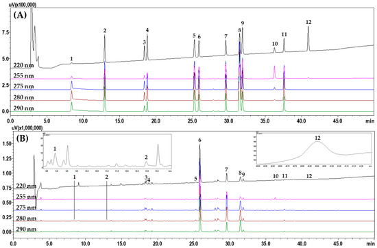 Representative HPLC chromatograms obtained for (A) standard solution and (B) 70% methanol extract of SRT water extract. The indicated peaks are 5-(hydroxy-methyl)furfural (1), 3,4-dihydroxybenzaldehyde (2), liquiritin apioside (3), liquiritin (4), coumarin (5), baicalin (6), wogonoside (7), cinnamaldehyde (8), baicalein (9), glycyrrhizin (10), wogonin (11), and atractylenolide III (12).