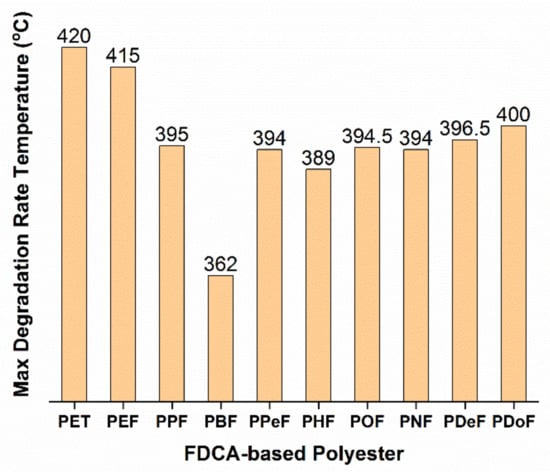 Although the degradation mechanisms of FDCA-based polyesters remain the same with varying aliphatic chain lengths, there are slight differences in thermal stability. Although degradation occurs over a temperature range, Figure 4 shows the change in temperature at which the maximum degradation rate takes place for the polymers. The first data point in Figure 4 is PET, which degrades at slightly higher temperatures than FDCA-based polymers, indicating that it is slightly more thermally stable at high temperatures. It is important that any polymer intended to replace PET be able to achieve thermal stability as close as possible to its petroleum analog. It can be seen here that for short-chain diols (C2 to C4), increasing the chain length decreases thermal stability. This is because as the chain gets longer, the polymer becomes more flexible and less crystalline. A minimum is reached in the PBF. Then, the stability starts to slightly increase with increasing chain length. This is most likely due to the ability of longer polymer chains to fold and become more crystalline.