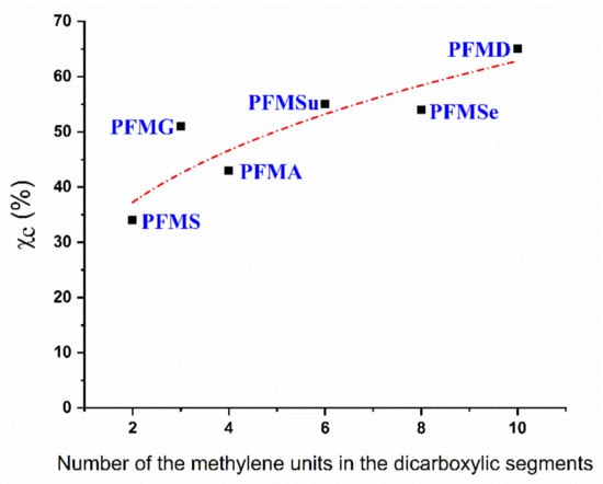 Degree of crystallinity (χC) of the 1,5-bis(hydroxymethyl)furan-based polymers with varying number of methylene units in the diacid ethyl esters. Reprinted with permission from reference []. Copyright 2014 American Chemical Society.