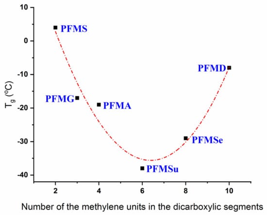 Glass transition temperature of 2,5-bis(hydroxymethyl)furan-based polyesters of increasing diacid chain length. Reprinted with permission from reference []. Copyright 2014 American Chemical Society.