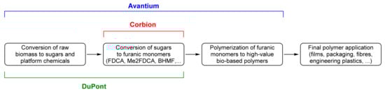 Although Avantium plans to cover the production chain from raw material to final application, other companies are making progress by focusing on smaller sections of the supply chain (Figure 7). As discussed above, DuPont has developed a process with ADM to produce the dimethyl ester of FDCA, Me2-FDCA, from fructose via HMF. Although they are conducting studies on polymerizing the ester with propanediol to produce poly(trimethylene furanoate), their current focus is on producing Me2-FDCA as a monomer for sale and application []. This is in contrast to Avantium, who focuses on a specific monomer (PEF). As different furanic polymers are tested and come to market, DuPont has more application flexibility as their product is not polymer-specific.