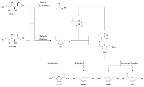 Despite extensive research, the production of the HMF platform chemical from abundant lignocellulosic biomass has been found to be uneconomical on an industrial scale in most cases []. Kang et al. proposed 5-acetoxymethylfufural (AMF) as a suitable alternative to HMF, as it can also be derived from cellulose and offers simple pathways to furan derivatives, including FDCA []. As discussed earlier, HMF is produced by acidic dehydration of the carbohydrates in lignocellulosic biomass, a reaction that involves many side reactions. By-products, including levulinic acid and insoluble polymeric humins, are formed during the hydrolysis and condensation of HMF, which reduces the selectivity and efficiency of the process []. In contrast, AMF can be easily synthesized from lignocellulosic biomass-derived 5-chloromethylfurfural (CMF) and alkylammonium acetates in a process without side reactions and/or by-products (Scheme 2). The acetoxymethyl group in AMF makes the compound less reactive and more hydrophobic than the hydroxymethyl group in HMF. This stability (and hydrophobicity) facilitates the isolation of AMF from the produced mixture allowing purities of up to 99.9% to be achieved.