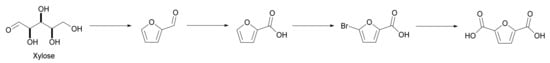 The other important platform chemical which can be obtained by acid-catalyzed hydrolysis of lignocellulosic biomass is furfural []. Produced from the xylan or hemicellulose contained in lignocellulose, furfural is a bulk chemical produced on a scale of 280,000 tons per year. Thus, the production of FDCA from furfural as a platform chemical may be more attractive than that from HMF, which has not yet been proven to be produced on a scale comparable to furfural []. This section presents three potentially valuable routes to FDCA from furfural.