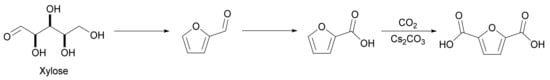 Interestingly, 2-furancarboxylic acid can also be directly carboxylated to FDCA using CO2 or inorganic carbonates. Dick et al. developed a process of producing FDCA by this method with an isolated yield of 89%, using a molten salt of cesium carbonate (Cs2CO3) (Scheme 4) []. Although this method has shown good results on a laboratory scale, the industrial scalability of this process would be economically limited by the relatively high cost of cesium carbonate.