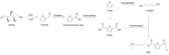 As shown in Scheme 5, this method first involves the oxidation of the furfural feedstock into 2-furancarboxylic acid. Catalytic aerobic oxidation is suggested for this []. The monoacid is then catalytically disproportionated into furan and FDCA by a variation of the Henkel reaction. Furan is converted to 1,4-BDO preferably through direct hydrogenation, but also possibly by catalytic oxidation to maleic anhydride and subsequent hydrogenation to 1,4-BDO through butyrolactone. Polycondensation can then be used to produce PBF. This method not only successfully produces FDCA from furfural but also produces an aliphatic diol that can be used to obtain a bio-based furanic polymer. As will be discussed in the next section of this review, polymerization with diols is FDCA’s main application. Most polymer synthesis processes utilize an aliphatic diol (such as 1,4-BDO) from one source and FDCA from another. If both components of polymerization can be synthesized from the same source of the platform chemical, it significantly simplifies process feedstock economics and increases the carbon utilization of the lignocellulosic biomass. Although only proven at the lab scale to date, this route has significant potential if it can be scaled up to commercial volumes.