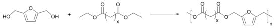 Polymerization of 2,5-bis(hydroxymethyl)furan with diacid ethyl esters of varying methylene units to produce corresponding polyesters.