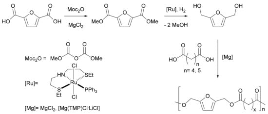 - Guillaume, L.; Marshall, A.; Niessen, N.; Ni, P.; Gauvin, R.M.; Thomas, C.M. Multicatalysis from renewable resources: A direct route to furan-based polyesters. Green Chem. 2021, 23, 6931–6935. [Google Scholar] [CrossRef]