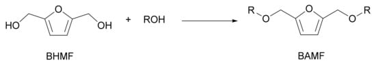 Etherification via dehydration of 2,5-bis(hydroxymethyl)furan (BHMF) with alcohol to 2,5-bis(alkoxymethyl)furan (BAMF).