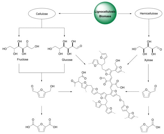 The most common method for the synthesis of FDCA from lignocellulosic biomass is the catalytic oxidation of HMF []. Despite a large number of studies on the process, this route is still not economically feasible on an industrial scale due to the cost of the process along with technical issues such as the low efficiency in the production and isolation of HMF from lignocellulosic biomass and the poor selectivity to FDCA [,]. Lignocellulosic biomass comes from waste streams such as agriculture, forestry, and paper, and therefore does not compete with food sources. Lignocellulose itself is a composite of three types of materials: lignin (an aromatic polymer), cellulose, and hemicellulose (hexose and pentose polysaccharides) []. The acid-catalyzed hydrolysis of cellulose and hemicellulose produces glucose, fructose, and xylose, which can be dehydrated to produce the platform chemicals HMF and furfural. These compounds are furanic molecules functionalized with formyl- and hydroxymethyl groups that can be converted to a wide range of highly valuable C6-bifunctionalized furanic products.