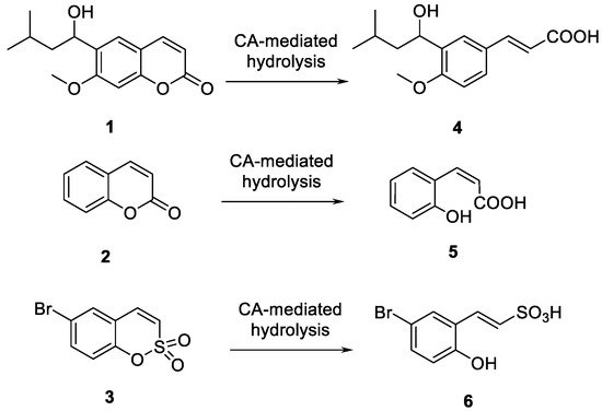Coumarins 1 and 2, and sulfocoumarin 3 and their CA-mediated hydrolysis to the CAI active species 4, 5 and 6, respectively.