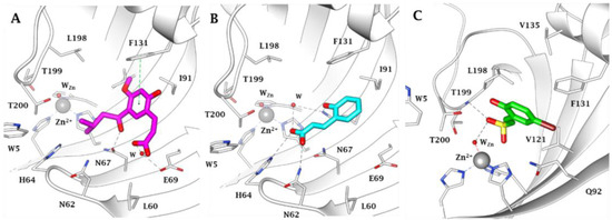 A ribbon view of the active site of hCA II in adduct with (A) Compound 4 (cyan, PDB 5BNL), derived from the CA-mediated hydrolysis of coumarin 1; (B) Compound 5 (magenta, PDB 3F8E), derived from the CA-mediated hydrolysis of coumarin 2. (C) Compound 6 (green, PDB 4BCW), derived from the CA-mediated hydrolysis of sulfocoumarin 3. The Zn(II) is shown as a grey sphere that is bound to the protein His ligands (labels not shown). Water molecules are represented as red spheres. H-bonds are represented as black dashed lines.
