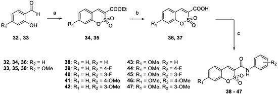 A cyclization reaction was performed between starting materials 32, or salicylaldehyde, or 33, 4-methoxysalicylaldehyde, and ethyl 2-chlorosulfonylacetate in DCE at 90 °C in the presence of dry pyridine as a base; after that, the obtained ethyl esters (34, 35) were hydrolyzed in EtOH and NaOH 5M at reflux to release the carboxylic acid moiety of compounds 36 and 37. Finally, a coupling reaction was performed in dry DMF between appropriate anilines and intermediates 36 and 37 to give us products 38–47 with an amide as linker (Scheme 3).