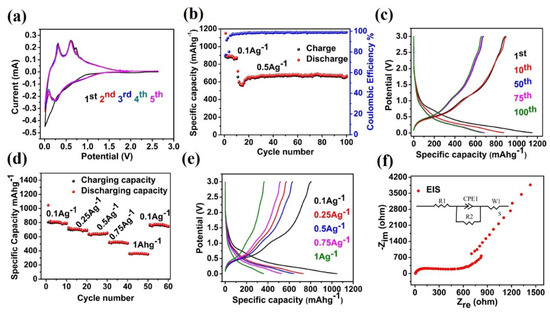 The electrochemical performance of the as-prepared Sn/C composite used an active-working negative electrode in combination with Li as a reference and counter electrode in the half-coin cell. The investigated and corresponding cyclic voltammogram (CV), cycle performance, galvanostatic charge/discharge profiles of different cycles, rate performance, and electrochemical impedance spectroscopy (EIS) are thoroughly and systematically shown in Figure 4. Figure 4a illustrates the CV result of the Sn/C-negative electrode in the potential window 0.01–2.8 V (vs. Li+/Li) at a scanning rate of 0.1 mV s−1 for the initial five cycles for the LIBs. At the first cathodic cycle, there were no obvious reduction peaks observed contributing to the formation of an SEI layer on the surface of the electrode. From the second to the rest of the cycles, two reduction peaks were observed at 0.1 and 0.2 V, showing the presence of carbon in the composite. Additionally, all the observed peaks from the second cycle were distinct and well-overlapped, suggesting stable electrochemical reversibility during the subsequent cycles. Figure 4b,c show the representative cycle performance and selective galvanostatic charge/discharge performance of the Sn/C electrode for the LIBs from 1st to 100th cycles at two different current densities 0.1 and 0.5 Ag−1. The electrode showed a superior cycling performance and delivered a high reversible capacity up to 10 cycles, but then suddenly dropped to 559.17 mAhg−1 when the current densities switched to 1 Ag−1. After several cycles, the capacity reached a maximum range of about 677 mAhg−1, with a stable cycle performance for the remaining 90 cycles. The irreversible capacity of the initial charge/discharge cycle, shown in the corresponding galvanostatic charge in Figure 4c, was due to the SEI layer formation on the electrode surface of Sn/C, and was in agreement with the first cycle shown in the CV (Figure 4b). The charge/discharge capacities of the composite electrode were calculated based on the actual mass contained by the electrode of carbon and tin. The coulombic efficiency of the first charge/discharge was observed at about 77.01%. However, the corresponding coulombic efficiency reached its maximum range of about 99%, even at a high current density, and maintained capacity (677 mAhg−1) for the remaining cycles. In order to ensure the stable and superior electrochemical performance of the Sn/C composite, carbon additives were added during the preparation of the electrode. The stable cycle performance and repeatable charge/discharge profile showed that the Sn/C composite is a suitable negative electrode for Li-ion storage. Figure 4d,e show the rate performance of the Sn/C anodes for LIBs. A series of current densities of 0.1, 0.25, 0.5, 0.75, and 1 Ag−1 was employed to evaluate the rate capability of the Sn/C anode for LIBs. When applying the respective current densities on Sn/C composite electrode for LIBs, the electrode displayed different capacities of about 814, 684, 633, 507, and 348 mAhg−1, respectively.