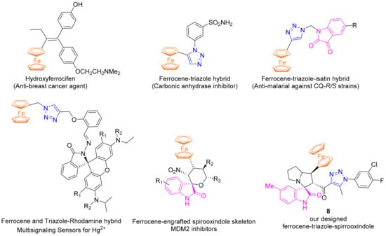Some ferrocene/ferrocene–triazole/ferrocene–spirooxindole-based pharmacophores.