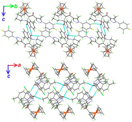 The supramolecular structure of 8 is controlled by the two intermolecular interactions depicted in Table 3 and is shown as a red dotted line in Figure 2. The H···O interaction distances are 2.05(2) and 2.22 Å for N4-H4N···O1 and C4-H4A···O1, respectively. Views along the ac and bc planes for the packing structures are shown in Figure 4.