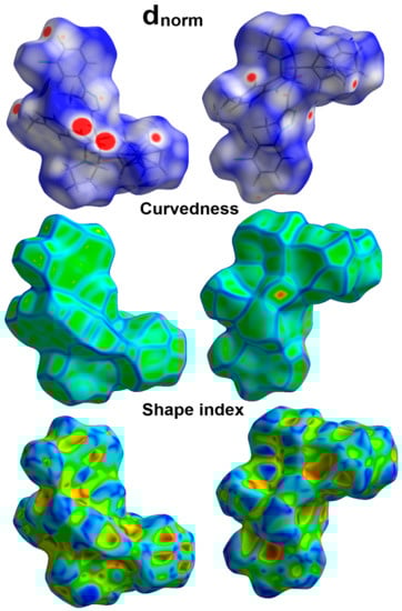 Crystal structure is built from the aggregation of molecular fragments via a definite set of intermolecular contacts, which hold these fragments in a certain organization in the crystal. Hirshfeld analysis is an important tool to detect all the intermolecular contacts, both at the qualitative and quantitative levels. There are three Hirshfeld surfaces, which are dnorm, shape index, and curvedness maps (Figure 5). The dnorm map sheds light on all intermolecular contacts in the form of red, white, and blue regions, which indicate shorter, equal, and longer interaction distances, respectively, than the vdWs radii sum of the interacting atoms. Shape index and curvedness maps with blue/red triangles and a green, flat area, respectively, are indicators of π–π stacking interactions.