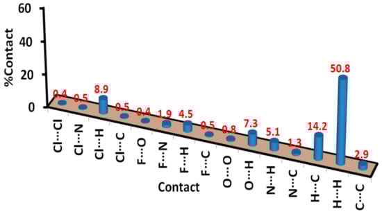 Many short contacts were detected from the analysis of the dnorm map. With the aid of a fingerprint, the different intermolecular contacts were predicted. It is found that the H···H (50.8%), H···C (14.2%), Cl···H (8.9%), O···H (7.3%), and N···H (5.1%) contacts are the most dominant. The percentages of all possible contacts in the crystal structure of 8 are shown in Figure 6. Careful inspection of the dnorm map revealed the appearance of the O···H, N···H, H···C, F···H, F···C, and O···O contacts as red spots, as shown in Figure 7. In the same figure, the decomposed fingerprint plots clearly show the characteristics of the sharp spikes for the short-distance interactions. All these short contacts, along with their corresponding interaction distances, are listed in Table 4.