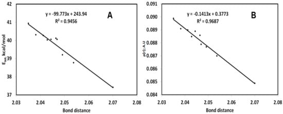 Correlations between bond distances, and ρ(r) (A) and Eint. (B).