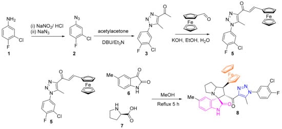 3.2. Synthesis of (1′R,2′S,3R)-2′-(1-(3-Chloro-4-fluorophenyl)-5-methyl-1H-1,2,3-triazole-4- carbonyl)-5-methyl-1′-(ferrocin-2-yl)-1′,2′,5′,6′,7′,7a′-hexahydrospiro[indoline-3,3′-pyrrolizin]-2-one 8