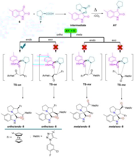 A novel, functionalized spirooxindole derivative linked to the ferrocene and triazole systems was synthesized, as shown in Scheme 1. The ethylene derivative 5 required for the [3 + 2] cycloaddition reaction was synthesized in consequential steps from 3-chloro-4-fluoroaniline, which is commercially available. The first step is to form the azide derivative, followed by a cycloaddition reaction to afford the acetyl-triazole derivative, and, finally, aldol condensation is employed to obtain the ethylene derivative having the new pharmacologically interesting hybrids. Ethylene derivative 5 was subjected into the [3 + 2] cycloaddition reaction, with the generated azomethine ylide (AY) from the 5-methyl isatin and L-proline, in refluxing methanol for 5 h. The final compound is obtained in a high-chemical yield and stereoselective fashion. The chemical architecture was assigned, based on single-crystal X-ray-diffraction analysis and a set of spectroscopic tools, including NMR and IR spectra. The plausible mechanism is depicted in Scheme 2, based on the previously reported literatures [33,34,35,36,37,38,39].