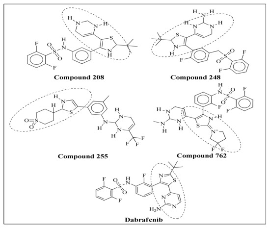 Clinically, sulphonamide-possessing drugs are used to treat lower urinary tract infections, whereas aromatic or hetero-aromatic sulphonamide derivatives possess a wide range of biological activities, including anti-tumor, anti-rheumatic, anti-microbial, and anti-inflammatory [18,19,20,21]. These findings have provided a strong rationale to retrieve structural analogues of Dabrafenib containing a basic sulphonamide nucleus.