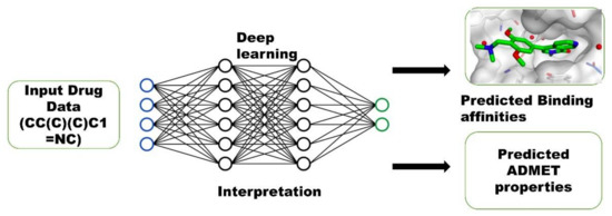 Dabrafenib, which has been approved by the FDA, has been found to be effective against BRAF-mutant melanoma with a high level of NEK9 protein expression. Dabrafenib’s inhibitory concentration was in the nanomolar range, 1–9 nM [1]. The drug’s effectiveness is largely determined by its binding affinity (IC50) and ADMET profile. Therefore, we have employed deep learning models to predict IC50, pIC50, and ADMET properties of top hits acquired through virtual screening in order to provide a direct comparison of binding affinities of top hits with standard Dabrafenib. Predicting the binding affinity and ADMET characteristics in silico, rather than using an experimental method, is a promising alternative. Deep learning (DP) models were used to predict drug target interactions (DTI) in the current work, which were formulated on encoder and decoder architectures. A DL model takes the SMILES string and amino acid sequence of the targeted protein as input and uses over 17 state-of-the-art DP learning techniques to predict drug efficacy indicators (Figure 2). The MPNN-CNN deep learning algorithms were used for affinity prediction in this work, while the MPNN model was used for ADMET predictions [32].