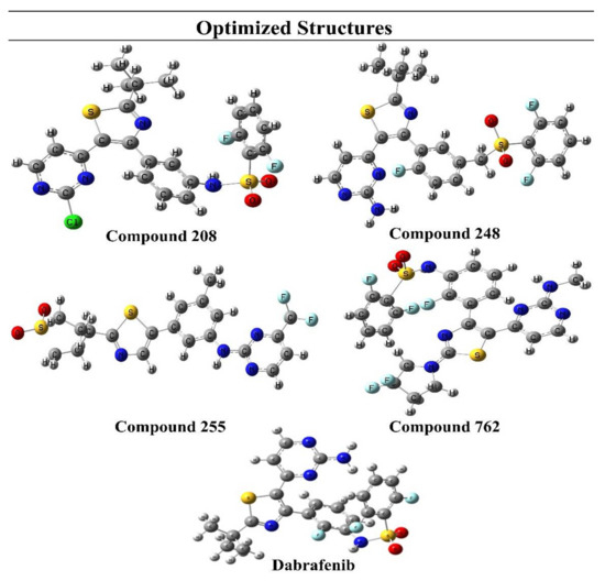 In the present study, geometries of FDA-approved drug Dabrafenib and top hits were completely optimized using the DFT/B3LYP method and 6-31G* as a basis set. No negative frequencies were obtained after the geometry optimization, which demonstrates that current geometries are true local minima. Optimized structures of drug candidates are presented in Figure 3.