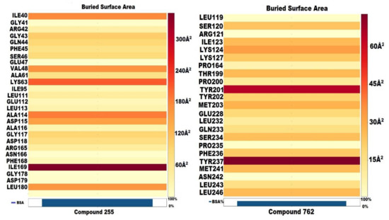 In terms of compounds 255 and 762, it was observed that both compounds significantly engaged the amino acid residues of the target protein. Compound 255, in particular, was burying the surface area of the NEK7 protein by up to 360 Å2. The BSA of compound 255 with VAL48, LYS63, ALA114, and PHE168 was 168, 212, 187, and 351 Å2, respectively, which was the best among all top hits. These values demonstrate the strong nature of molecular interactions existing between the target protein and compound 255. In the case of compound 762, important amino acid residues were buried by compound 762. In particular, TYR201, TYR237, and MET241 were significantly buried by compound 762 with BSA of 64, 72, and 25.6 Å2. Moreover, it was worth noticing that the major contributing atoms were oxygen, nitrogen, fluorine, sulphur, and chlorine, which were involved in increasing the contact surface area of compounds with a targeted protein. The BSA of compounds 255 and 762 is shown in Figure 10.