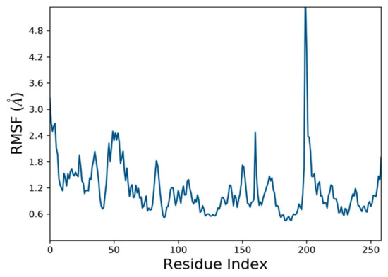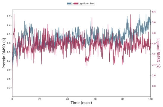 The molecular docking technique is comparatively rapid and imprecise. The docking deficiencies and flexibility of protein may interfere with protein–ligand complex. However, molecular dynamic simulations are computationally expensive and time-consuming but provide reliable and accurate illustration of protein displacement. Considering these facts, molecular dynamic simulations were undertaken using Desmond software package [58,59]. The root-mean-square deviation (RMSD) patterns provide significant insight into average change in displacement of atoms with respect to a frame. The RMSD trajectory provides information about the structural configuration of protein. It is computed for each frame of the trajectory. In order to gain insight into the structure of a protein, it is important to monitor the protein’s RMSD. Plotting the RMSD of the ligand is possible once the protein–ligand complex is aligned on a reference protein backbone and the RMSD of the ligand heavy atoms is measured. It is likely that the ligand has diffused from its initial binding site if measured values exceed the protein’s RMSD by a substantial margin. Molecular dynamic trajectory analysis is also used to determine the root-mean-square fluctuation of the targeted protein.