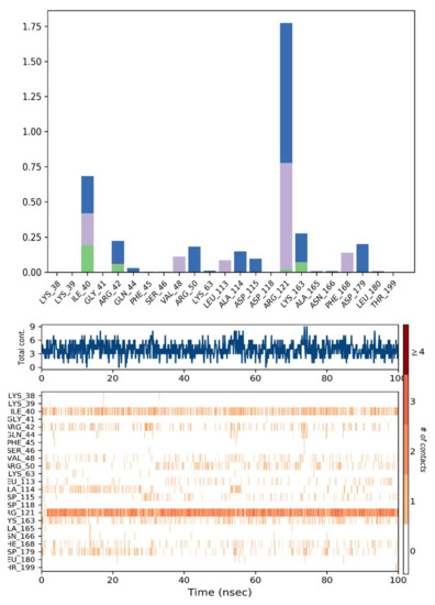 The hydrogen bond with ALA114 existed for more than 25% of simulation time. Hydrophobic interactions existed between VAL48, LEU113, VAL48, and PHE168. These molecular interactions contributed towards stabilizing the protein–ligand complex.