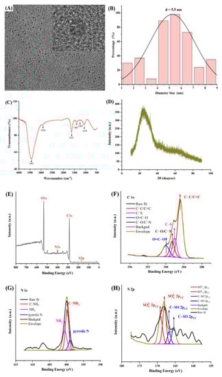 (A) TEM images of CQDs, insert: high-resolution TEM images of CQDs. (B) The size distribution histogram of CQDs. (C) FT−IR of CQDs. (D) XRD of CQDs. (E) XPS of CQDs. (F–H) High-resolution spectra of C1s, N1s, and S2p for the CQDs.