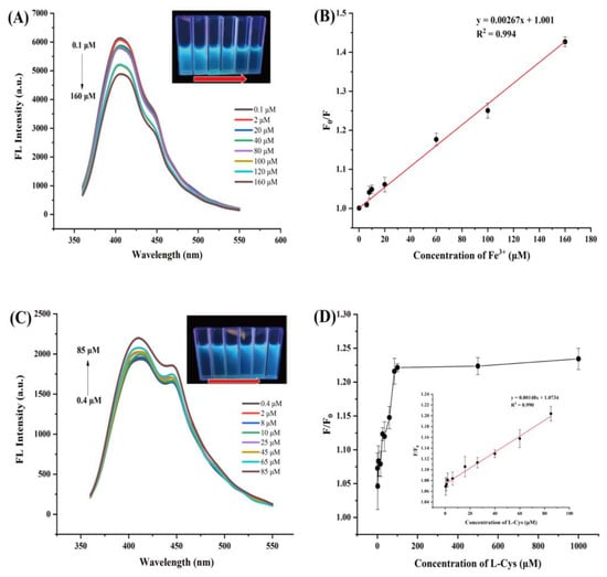 (A) Fluorescence spectra of CQDs (0.01 mg/mL) with various Fe3+ concentrations of 0.1–160 µM. Insert: photograph of CQDs with Fe3+ solutions under UV light (concentrations of Fe3+ are 0.1, 6, 10, 20, 100, and 160 μM; follow red arrow). (B) Relationship of F0/F and Fe3+ concentration. (C) Fluorescence spectra of CQDs/Fe3+ systems of different concentrations of L-Cys. Insert: image of CQDs/Fe3+ aqueous solutions treated with different concentrations of L-Cys under UV light (concentrations of L-Cys are 0.4, 6, 16, 26, 40, and 85 µM; follow red arrow). (D) Relationship of F0/F and L-Cys concentration. Insert: Linear relationship between F0/F of CQDs and concentration of L-Cys from 0.4 µM to 85 µM.