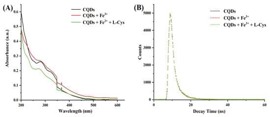 The photoluminescence quenching process is complex, usually including static and dynamic quenching. In this study, CQDs displayed a “turn-off–on” mode when adding Fe3+ and L-Cys into CQDs aqueous solution. When Fe3+ was added, the fluorescence intensity of CQDs was reduced (Scheme 1), which may be due to the coordination of S-containing groups of CQDs with Fe3+ to form Fe3+-S bonds []. However, the CQD fluorescence recovered after adding L-Cys into the CQDs/Fe3+ mixture, which may be caused by stronger binding interaction between Fe3+ and L-Cys, meaning that Fe3+ can be desorbed from the CQD surface. The fluorescence-sensing process can be studied with the experiments of UV absorption spectroscopy and fluorescence lifetime measurement. As shown in Figure 4A, the characteristic absorption peak of CQDs was obviously red shifted from 318 to 328 nm in the presence of Fe3+, indicating that Fe3+ formed a complex with the CQDs. However, under the presence of L-Cys, the absorption peaks for the CQDs recovered to their original positions, which confirmed the removal of Fe3+ on the CQD surface. Interestingly, an average fluorescence lifetime for the aqueous CQDs solution was 1.19 ns (Figure 4B), which was essentially the same as the lifetimes for the CQDs/Fe3+ system (1.22 ns) and after adding L-Cys to the system (1.20 ns). These results suggested that the fluorescence-quenching mechanism was static fluorescence quenching in these processes. Combined, these results suggested that the developed CQDs could be applied as bifunctional probes for Fe3+ and L-Cys recognition.