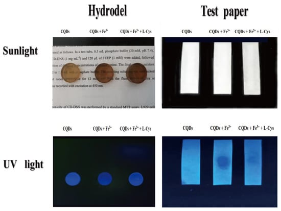 Cellulose/CQDs composite hydrogels and CQD-based strip-type test papers (Figure 5) were prepared using simple blending and coating processes. The composite hydrogels and CQD-based test papers had good biocompatibility and biodegradability because they were composed of cellulose and CQDs. After the addition of Fe3+ (Figure 5), the cellulose/CQDs hydrogels and CQD-based test papers showed color changes and drop-offs in fluorescence. Surprisingly, the cellulose/CQDs hydrogels and CQD-based test papers then showed obvious color recovery with the addition of L-Cys. Therefore, cellulose/CQDs hydrogels and CQD-based test papers could act as optical sensors for Fe3+ and L-Cys. Compared with aqueous solutions of CQDs, the CQD-based hydrogels and test papers were easier to operate and use, and, therefore, had broader application prospects. More importantly, both cellulose/CQDs hydrogels and CQD-based test papers were environmentally friendly and disposable. All these findings suggested that the prepared CQDs had great potential for applications as bifunctional sensors for recognition of Fe3+ and L-Cys.