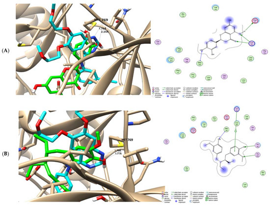 Binding disposition and analysis of ligand–receptor interactions of the two docked compounds inside the EGFR protein: (A) (+) eriodictyol and (B) secoisolariciresinol, with 2D and 3D interactive images. The co-crystallized ligand is cyan-colored, while the docked compounds are green-colored. The EGFR protein (PDB = 1M17) was freely accessible from the protein data bank.